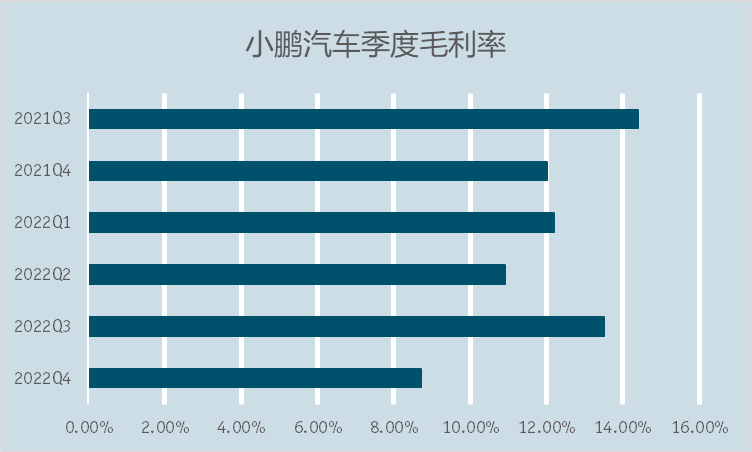 不过小鹏似乎并没有受到同行价格战的触动,最新发布的P7i车型加量又加价,起售门槛提高了4万。这一方面可能是为了跟老款P7形成阶梯搭配,另一方面可能是因为小鹏确实没有降价空间了。根据财报,小鹏去年第四季度的毛利率只有8.7%,相比上个季度的13.5%大幅回落,并创下近六个季度以来的新低。