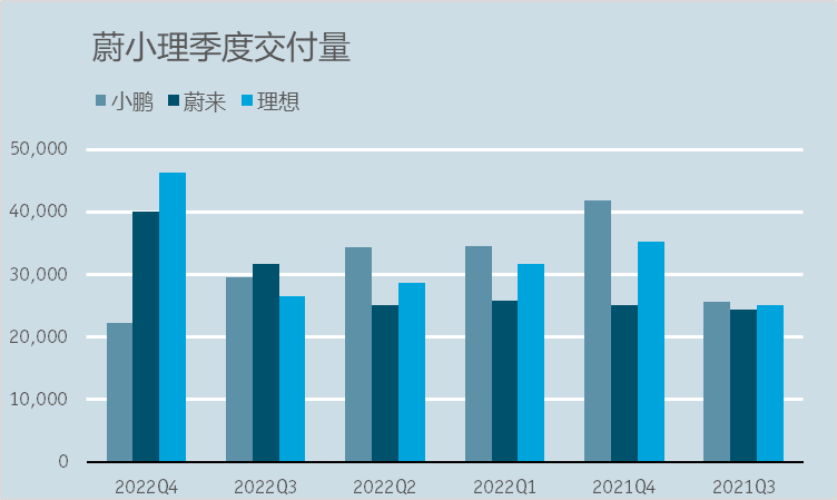 刚刚过去的2022Q4,可能是小鹏汽车历史上最难的一个季度,因为其这三个月的交付量创下了近六个季度以来的新低。横向对比来看,小鹏在2022Q4之前季度交付规模一直跟蔚来和理想处于同一水平。但到了去年Q4,在平均售价明显低于另外两家的前提下,小鹏的交付量反而突然被拉开巨大差距,整体甚至不足理想的一半。
