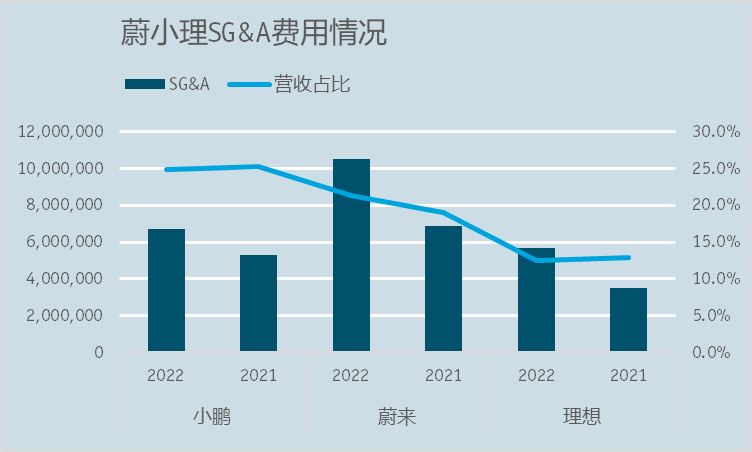 另一个压缩小鹏价格腾挪空间的因素,还有小鹏汽车相对较低的运营效率。过去的2022年,由于行业竞争加剧,蔚小理三家的销售、一般和管理费用(SG&A)都有大幅攀升。但即便如此,小鹏的SG&A费用占比仍明显高于其他两家:小鹏2022年25%的SG&A费用占比,刚好是理想12.5%的两倍。