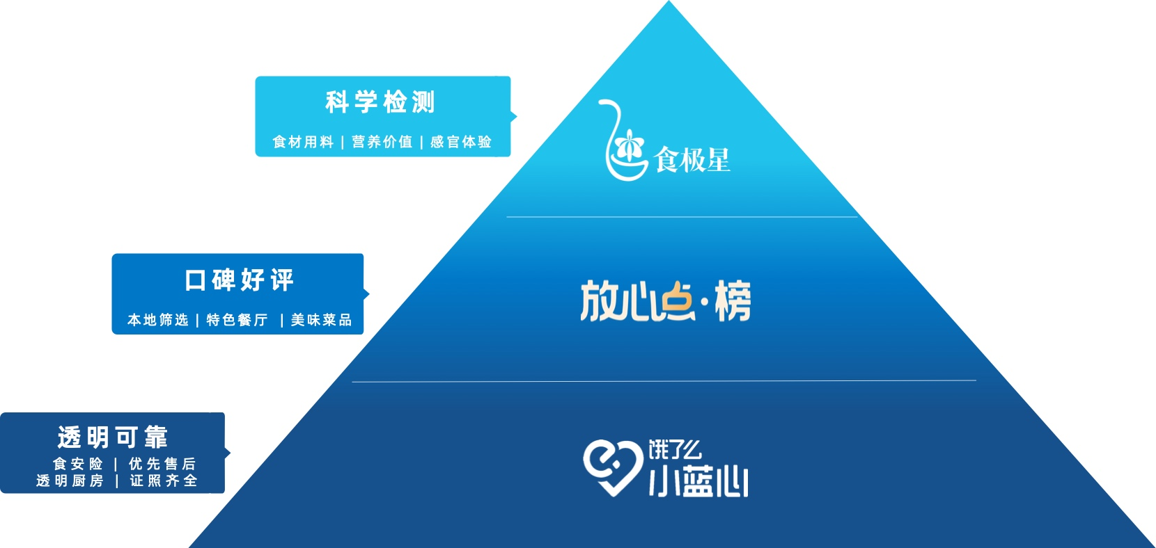 引领食安建设透明可靠的“小蓝心”,呈现城市食客口碑好评的“放心点•榜”,以及体现权威机构科学检测的“食极星”认证,构建起了饿了么为消费者实现“放心点”的业务落实框架。