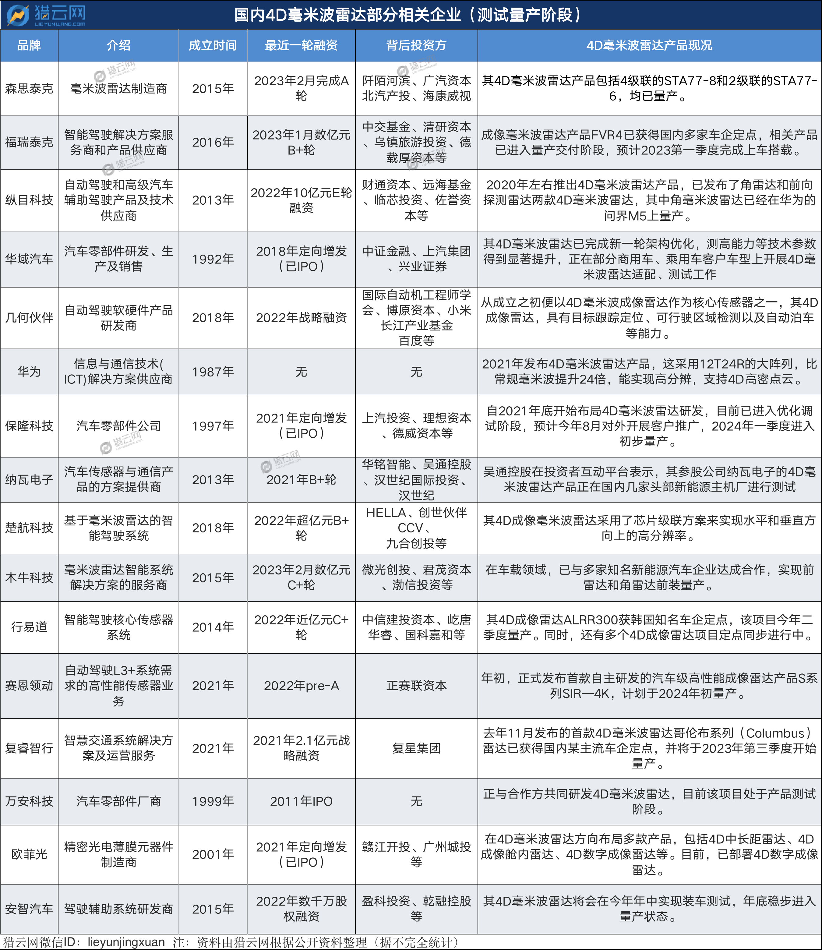 就猎云网统计,从已在测试量产阶段的国内4D毫米波雷达部分相关企业来看,今年以来,福瑞泰克、森思泰克、木牛科技相继完成融资,而在去年,赛道的融资热度就已经点燃,有6家企业完成融资,其中几何伙伴的融资交易量最为惊人,2021年一年融了4轮,2022年融了2轮。