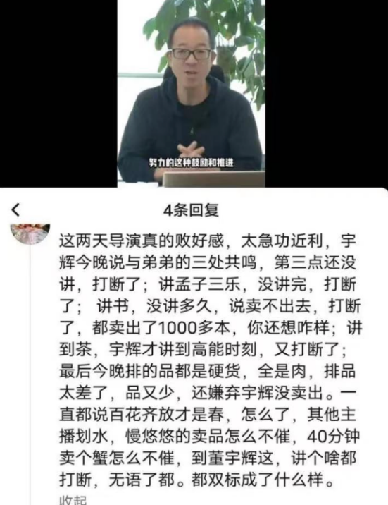 这种博弈引起了粉丝的强烈不满,比如有网友曾对导播多次打断董宇辉表示不满,“导播真的败好感,宇辉说与弟弟的三处共鸣时,第三点还没讲,打断了;讲孟子三乐,没讲完,打断了;讲书,没有讲多久,说卖不出去,打断了;讲到茶,才讲到高能时刻,又打断了。”
