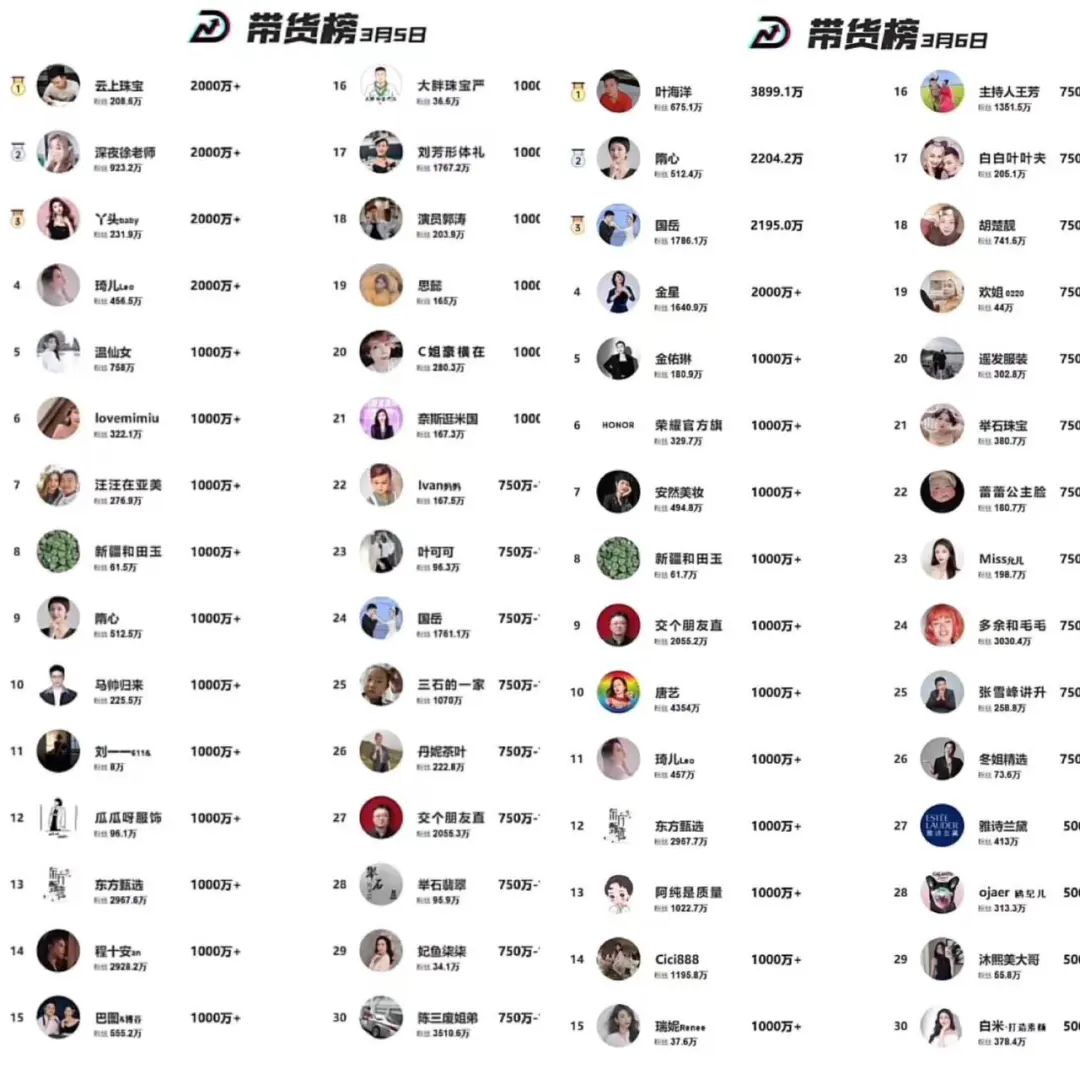 字母榜曾报道,1月20日至2月20日,东方甄选月销售额从此前的5~7亿元,跌至2.5~5亿元。抖动数据显示,3月5~6日,东方甄选1000万+的带货数据已经跌出带货榜单前十。