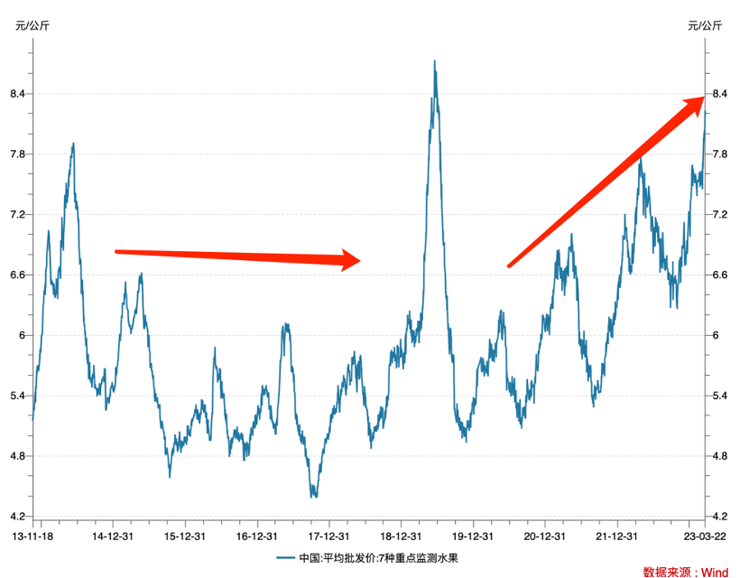 在上图中,我们就可以比较清楚看到,重点监测的7种水果价格在2019年之后价格中枢乃是不断上移的(鸭梨、富士苹果、巨峰葡萄、香蕉、菠萝、蜜桔、西瓜)。其中原因有许多,诸如仓储效率提升使得水果可以更多进行跨季节销售等等。