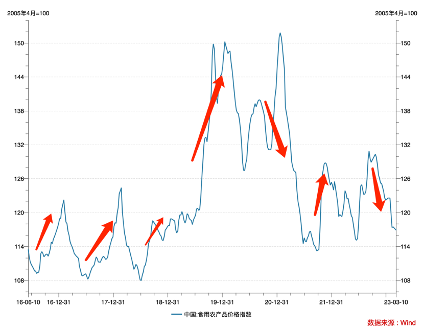 市场经济中,商品价格取决于供需关系,一般情况下,Q4往往是食用农产品价格的上涨周期(商务部数据)。在上图中大多数时间也确实如此,其中2020和2022 年则走出了完全相反走势:价格曲线大幅下挫。