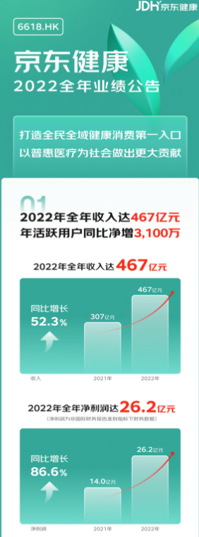 3月22日,京东健康股份有限公司发布2022年全年业绩公告。报告期内,京东健康收入总额为467亿元,同比增长52.3%,非国际财务报告准则指标下净利润为26.2亿元,同比增长86.6%。