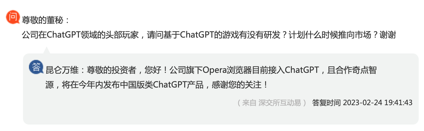 然而,近日昆仑万维在回复深交所关注函及股价异动公告中称,“截至目前,公司AIGC、人工智能等业务产品尚未产生实际收入,预计对公司2023年财务状况不会产生较大影响”、“公司和奇点智源合作开发中国版类ChatGPT,预计今年内将发布中国版类ChatGPT,并且会将代码开源。中国版类ChatGPT的知识产权归奇点智源所有,后续公司享有中国版类ChatGPT商业化产生的净利润的50%,但能否顺利实现商业化存在较大的不确定性。”