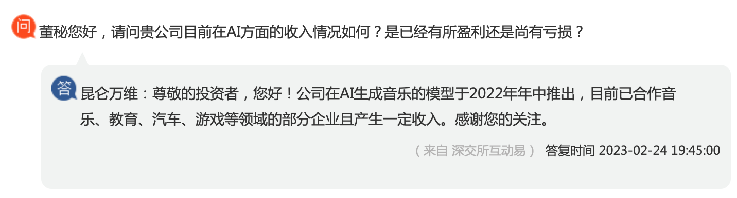 今年2月,昆仑万维在互动平台回复AIGC、ChatGPT等有关提问时表示,AI生成音乐的模型于2022年年中推出,目前已合作音乐、教育、汽车、游戏等领域的部分企业且产生一定收入。同时,公司还表示与奇点智源合作,将在今年内发布中国版类ChatGPT产品。这一系列消息的透露推动昆仑万维自今年3月以来股价涨幅超过80%。