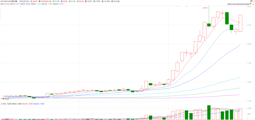 中国卫通(601698.SH),一家此前并不起眼的中字头股票,从3月初开始启动,截至3月23日,上涨了81.34%,年初至今上涨幅度为115.32%,市值达到1039亿元。