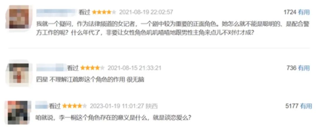 可是这样的身份,很难引起观众的共鸣。“关系户”身份让她们在工作中一往无前的态度,看起来天真又莽撞,她们还要肩负起扫黑剧中不多的“情感戏”重任,跟主角“不打不相识”的情感升温中,还要做许多观众看来非常“捣乱”的行为。因此在这两部剧里,这两个女记者的角色都是口碑最差的角色之一。