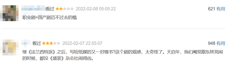 让主角回到21世纪初做主角的《不止不休》,有了7.5分的豆瓣开分。最高赞评论写道:“张颂文一出场我就泪目了,看他风尘仆仆穿个旧皮夹克,带着报业黄金时代的气味回来,为自己失落的遥远的曾经真实存在过的新闻理想,哭。”