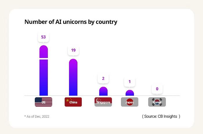 根据全球科技市场追踪机构 CB Insights 的数据,截至 2022 年 12 月,美国的 AI 独角兽数量最多,有 53 家初创公司。中国以 19 家位居第二,其次是英国有4家,但韩国却没有AI独角兽公司,而即使是国内生产总值 (GDP) 低于韩国的以色列也有 3 家。