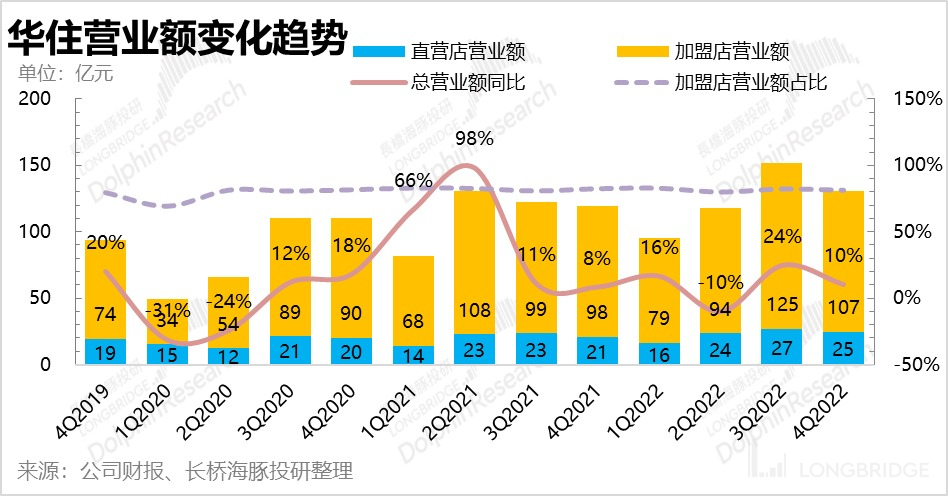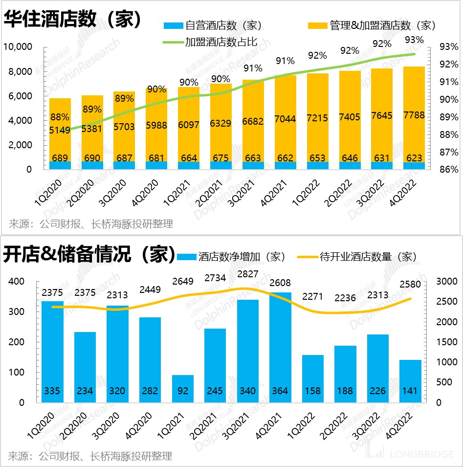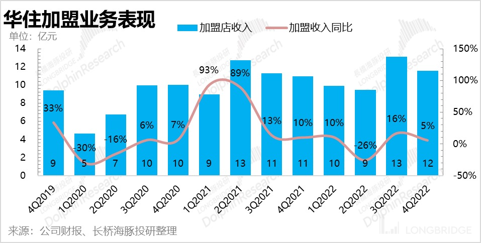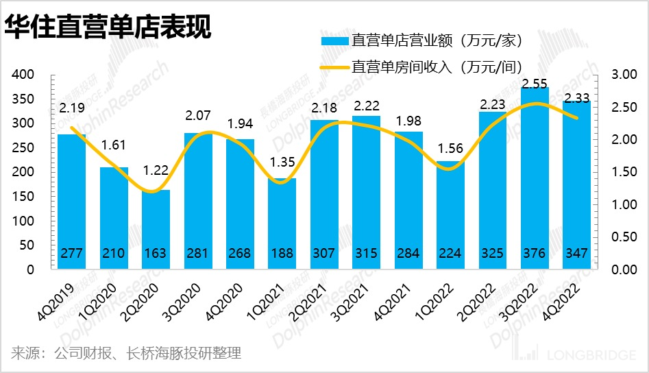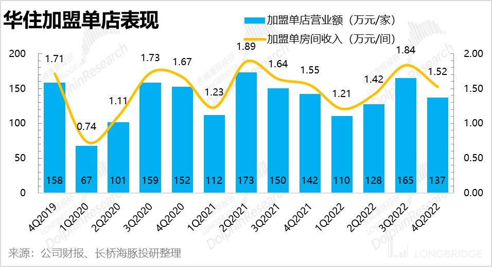 从加盟酒店营业额的角度上判断,当时还是一个好成绩。和直营店的表现有略微差异,在加盟业务方面,收入的增长更多是来源于门店的新增。但如果仅从单店收入或者是单房收入的角度来评价,不管是单店表现还是单房表现都略微逊色于上一年同期,同时也低于疫情前的水平。