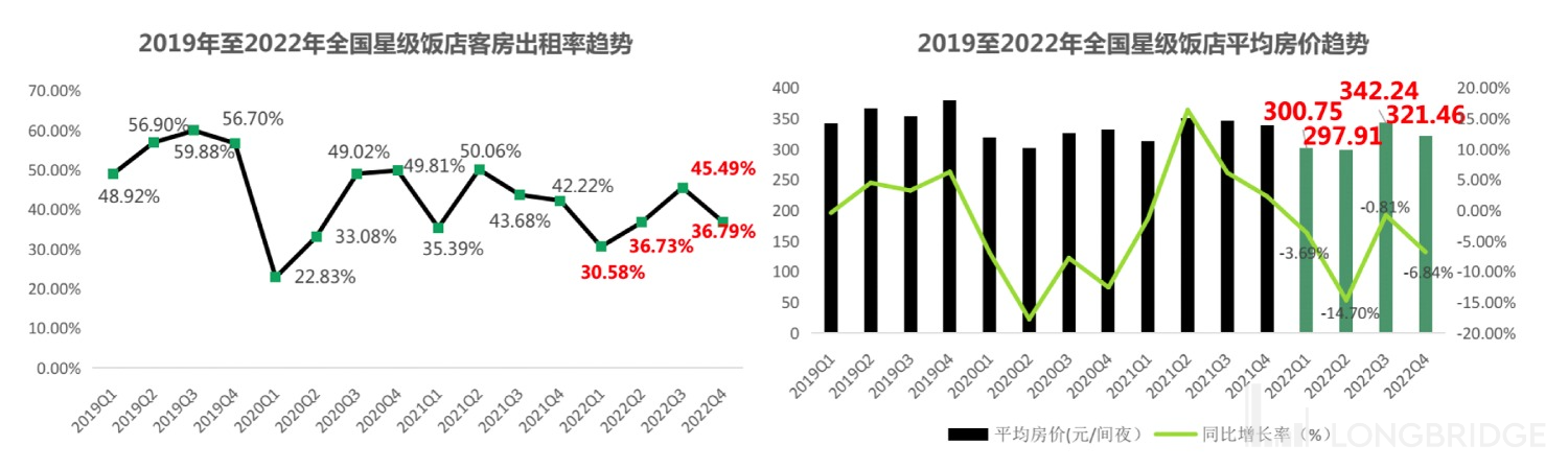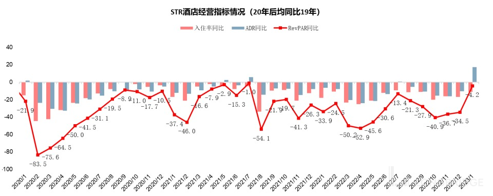 去年的环境下,不同于华住尚能保持一定的增长趋势,全国整体酒店的表现情况比较糟糕。同比基本都是下滑的状态,和 2019 年比差距更为明显。其中主要的问题,在于整体入住率的大幅下滑。而 ADR 通过最近两年,渐渐靠拢前期水平。