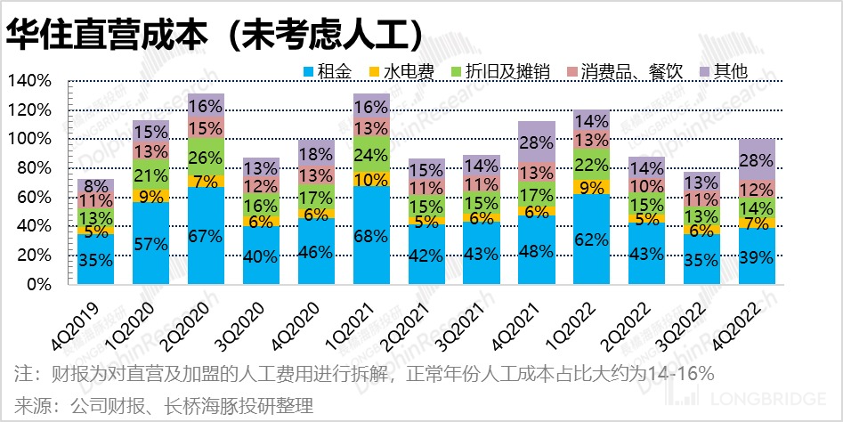 从下图的成本拆解来看,直营酒店的几块占大头、且刚性的成本(租金和折旧摊销),其实变化不算特别大。