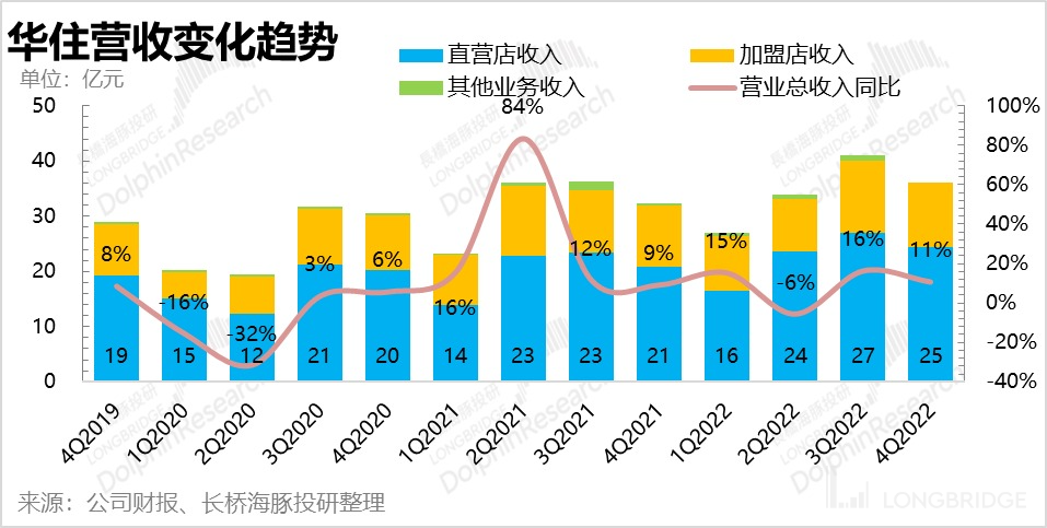 华住集团 2022 年第四季度总营业收入 37 亿元,同比增长 11%,和市场预期非常一致(因为一月份已经公布过经营数据),主要的业绩贡是来源于源于酒店营业额的提升。不管是直营业务还是加盟业务都没有掉链子,不过相比之下,直营业务的增速表现要更好一些(加盟收入占比环比下滑 1pct,变动不明显)。