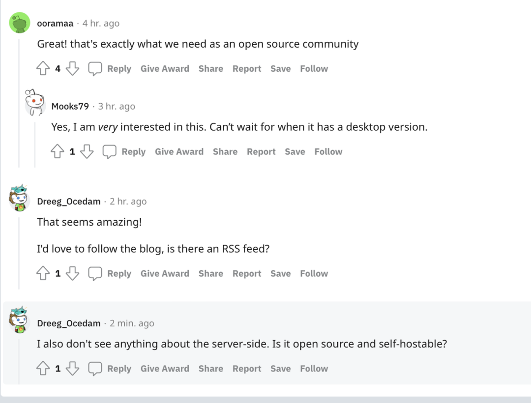 印象深刻的用户挺多的。例如我们的 LiveDemo 刚出,一位台湾用户花了两个多小时详细地给我们提建议、提 bug。还有一位孟加拉的 developer,写了一个32页的 PPT 给我们提反馈。我们还遇到一些南美的用户,提一些非常具体的需求,告诉我们如果后续真的做了,随时可以找他们帮助测试。