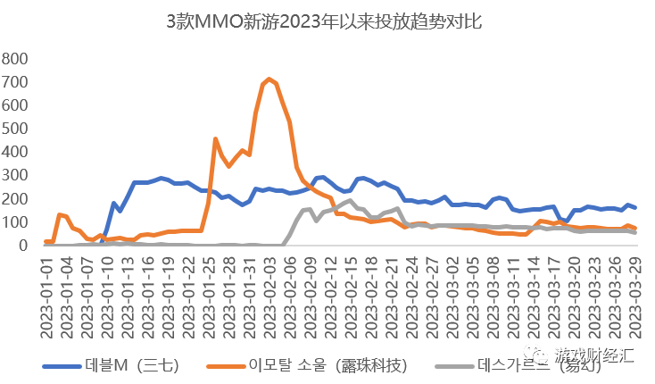 DataEye数据显示,露珠科技旗下MMORPG产品《이모탈 소울》2023年以来已经投放了近6000组素材,远高于同期MMO新游《데블M》、《데스가르드》。