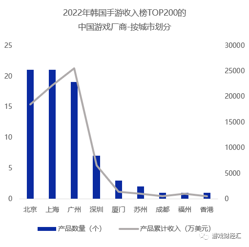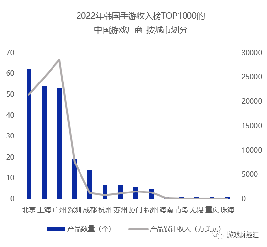 2022年,中国游戏厂商共有232款国产游戏进入韩国手游收入榜Top1000,累计收入约8.86亿美元。北上广三座城市依然领跑,三座城市包揽超7成的产品,以及8成以上的收入。其中,广州厂商入围产品共有53款,位列第三名,产品累计收入约2.85亿美元,位列第一名。如果把范围缩小到TOP200,中国游戏厂商共有76款产品入围,累计收入约7.7亿美元。![]()