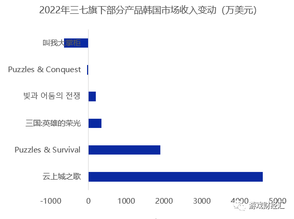 8家收入正增长的广州游戏厂商包括三七、网易、冰鸟游戏、露珠游戏、UnlockGame、小马游戏、黑胡子游戏、天游。值得关注的是,除了三七、网易两家大厂,冰鸟、露珠、Unlock、小马游戏等中腰部厂商表现较佳,入围产品均呈正增长。三七在韩国市场的收入增幅最大。三七2022年收入大幅增长主要由于《云上城之歌》、《Puzzles & Survival》两款产品收入大幅提升。![]()