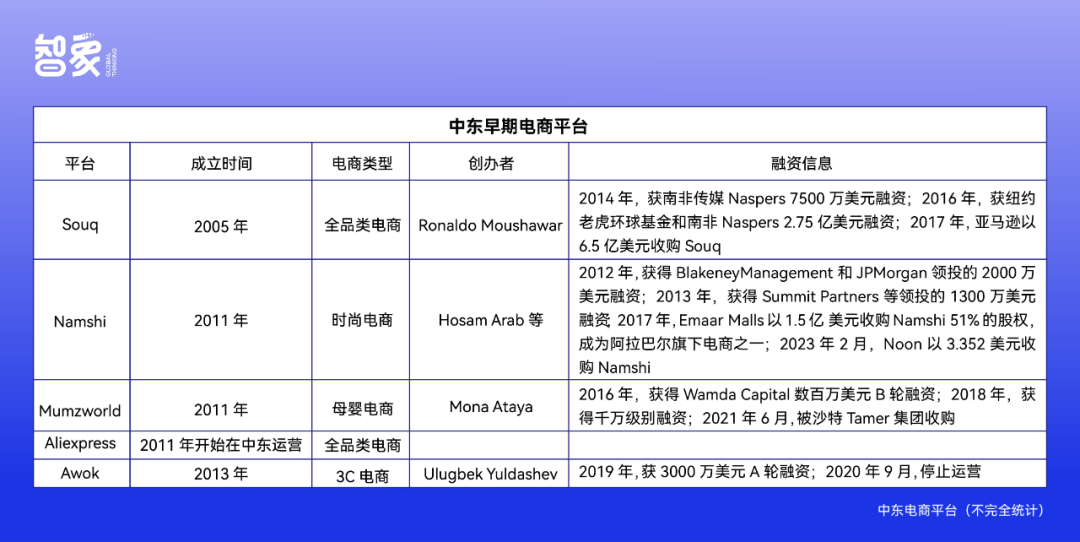 在执御之前,中东电商可以用贫瘠来形容。主要电商平台包括综合电商Souq、时尚电商Namshi、母婴电商Mumzworld、Aliexpress(速卖通)和3C电商Awok。