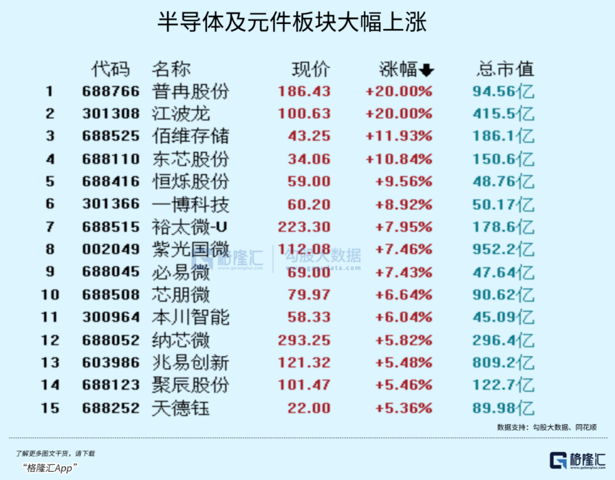 今天半导体及元件板块概念的普冉股份、江波龙双双20CM,还有好几个概念股涨幅都相当不错。