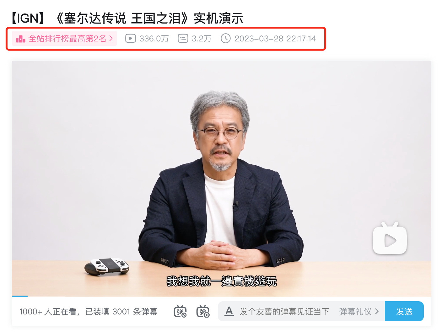 就比如任天堂,截止发稿前仅up主IGN中国在哔哩哔哩平台上的转载视频《塞尔达传说 王国之泪》实机演示播放量已经超过了330万(发布当天就超过了170万播放量),成为B站当天播放量第二高的视频。