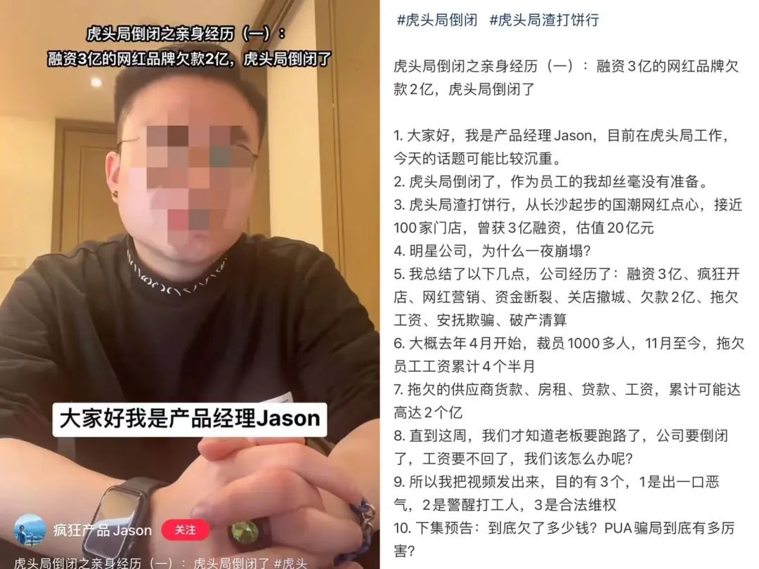 3月30日,小红书账号“疯狂产品Jason”发布了一篇文章,标题直指“虎头局倒闭”,并阐述其亲身经历,认为公司在融资3亿、疯狂开店、网红营销、资金断裂、关店撤城后,欠薪2亿、拖欠工资、安抚欺骗、破产清算。