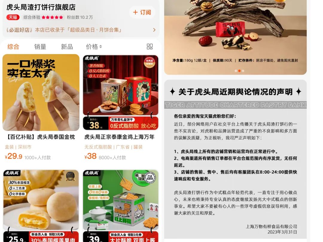 3月31日下午,对于近日网传的新中式点心品牌虎头局渣打饼行倒闭的消息,虎头局在天猫店发布公告回应称,倒闭信息不实,线上所有的店铺正常运营,订单将有序发货,无任何延迟。