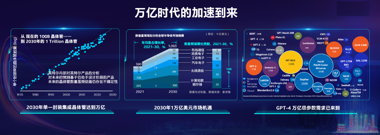 此次英特尔中国研究院、南京英麒智能科技2023探索创新日上,宋继强在主题演讲时表示,人工智能、智能计算作为数字化转型中非常重要的生产力,对于数字经济和GDP有巨大推动作用。在此背景下,三个“万亿”的时代正在加速到来:晶体管、大模型、半导体市场。