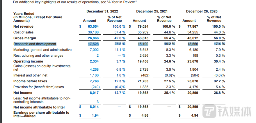 财报显示,2022年全年,英特尔研发投入达到175.28亿美元,占总收入比重的27.8%,远高于苹果(2022年研发支出77.09亿美元)、英伟达(73.39亿美元)等硅谷科技巨头,是美国科技企业里面研发支出最高的公司之一。(本文首发钛媒体App,作者|林志佳)