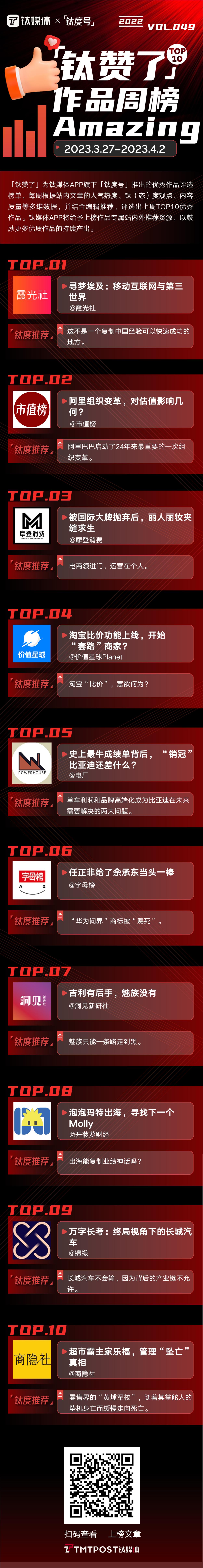 2023年3月27日—2023年4月2日,「钛赞了」榜单第49期上榜作品为: