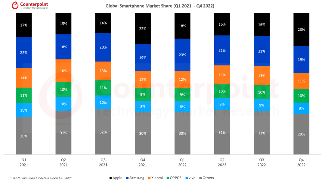 苹果智能手机出货量去年四季度再次反超三星,成全球第一 图源:Counterpoint