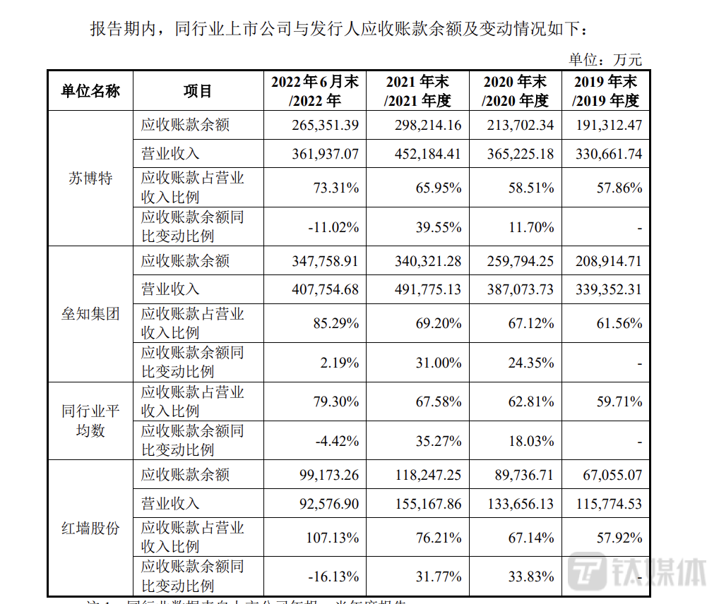 此前提到红墙股份业绩下滑的原因之一是加强对客户信用核查所致,而红墙股份之所以加强对客户信用核查,则因为公司的应收款项高居不下。具体来看,2019年-2022年6月末,红墙股份应收账款余额分别为6.71亿元、8.97亿元、11.82亿元、9.92亿元,公司应收账款账面价值占营业收入的比例分别为57.92%、67.14%、76.21%、107.13%。尽管红墙股份称公司所处行业内应收款项回款时间普遍相对较长,同行业上市公司应收账款余额占营业收入的比例均较高,报告期内,公司应收账款余额占营业收入的比重高于同行业,同行业平均水平分别为59.71%、62.81%、67.58%、79.30%。此外,公司近几年的应收账款周转率低于同行。2019年-2022年三季度末,同行业可比公司应收账款周转率的均值分别为2.06、1.87、1.85 和1.33,红墙股份的应收账款周转率分别为 2.06、1.77、1.56 和0.92。对于红墙股份应收帐款较高问题,公司多次强调通过加强对客户信用核查的方式,收紧对回款能力弱、规模较小等客户新业务的审批,从而保护自身权益。正因如此,深交所要求公司说明公司采取的具体措施及效果。
