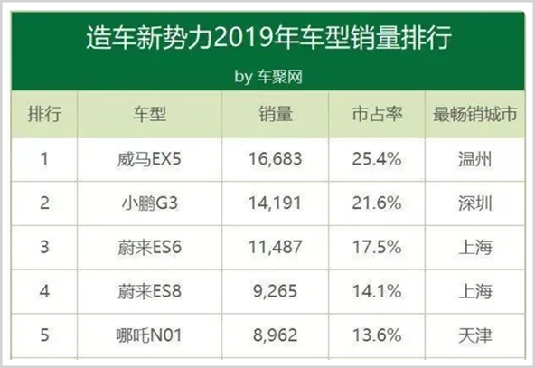 在EX5的加持下,2019年,威马全年交付新车1.68万辆,位居新势力交付榜亚军宝座,仅次于蔚来的2.06万辆。