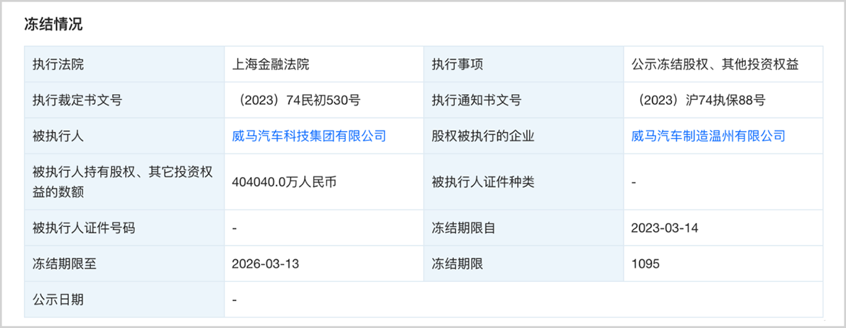 3月29日,威马汽车的子公司被冻结股权40.4亿元。相当于威马近三分之一的“身家性命”。
