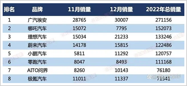可到了2022年,威马在上行的行业大势中,逆势下跌,全年销量29327辆,同比下降33.6%。被哪吒和埃安拉开了十几万,甚至二十多万辆的差距。