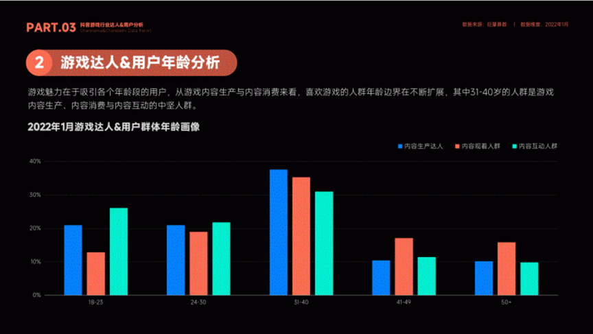 据蝉妈妈《2022抖音游戏行业报告》显示,1-2月和7-8月的寒暑假期间是抖音平台上游戏关键词的搜索巅峰。在2022年1月的游戏内容观看人群中,占比最高的是31-40岁人群,达到约36%,约等于18-30岁人群的总和,且40岁以上人群也有接近30%的占比。这样的比例结构显然不符合游戏市场的实际用户年龄结构,合理推测30岁以上人群中有不少是未成年人在使用长辈抖音账号观看游戏内容。