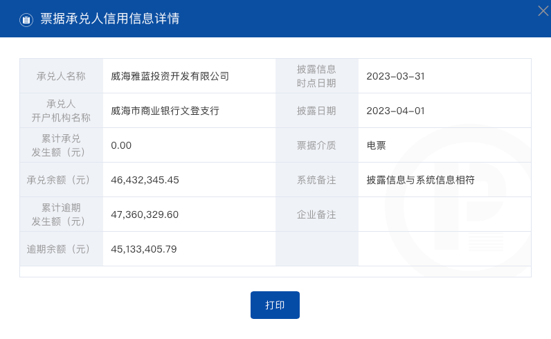 4月1日,上海票据交易所披露了一则威海雅蓝投资开发有限公司(以下简称“威海雅蓝投资公司”)的票据逾期信息,截至2023年3月31日,威海雅蓝投资公司承兑票据累计逾期金额为47360329.60元,逾期余额45133405.79元。