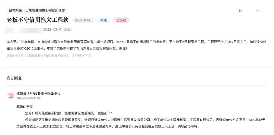 根据企查查信息,作为威海冠军体育小镇的操盘方,早在2022年6月,威海雅蓝投资公司已经出现票据违约,自2020年7月起,威海雅蓝投资公司生成多条历史被执行人记录;而更早前的2022年2月,人民网领导留言板就有项目施工人员在线讨薪,其负责工程于2020年7月底完工,但施工款一直拖欠未付;相关回复直言,建设单位(威海雅蓝投资公司)资金不足,已对其下达催缴通知单。