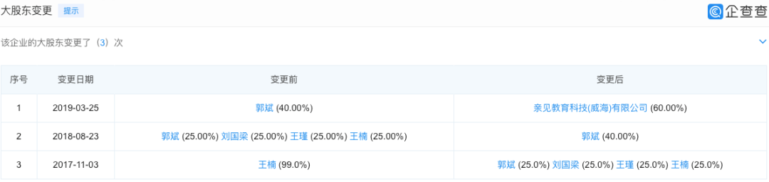 2019年3月,亲见体育文化传媒公司股权结构再次变更,亲见教育科技(威海)有限公司(以下简称“亲见教育科技公司”)和沈阳梁赢体育文化发展有限公司(以下简称“沈阳梁赢体育公司”)分别持股60%和40%,其中,亲见教育科技公司由郭斌、王楠分别持股60%和40%。
