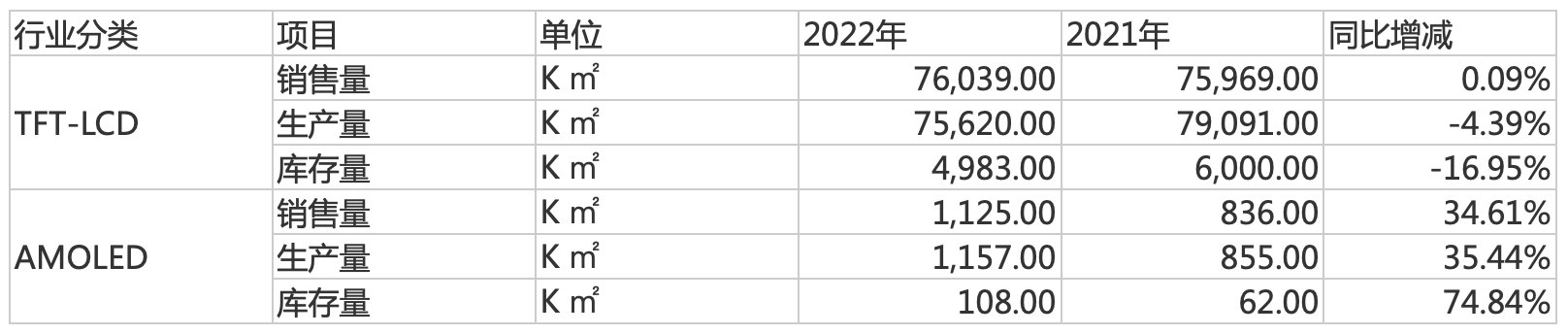 从行业角度,去年半导体显示行业延续了2021年下半年的下行趋势,全球面板出货面积和出货量双双下滑。根据CINNO Research的数据,2022年全球整体面板出货面积同比下降7%,出货量同比下降超过8%,叠加面板价格大幅下降的影响,预计2022年全球面板企业的生产产值同比下滑23%。