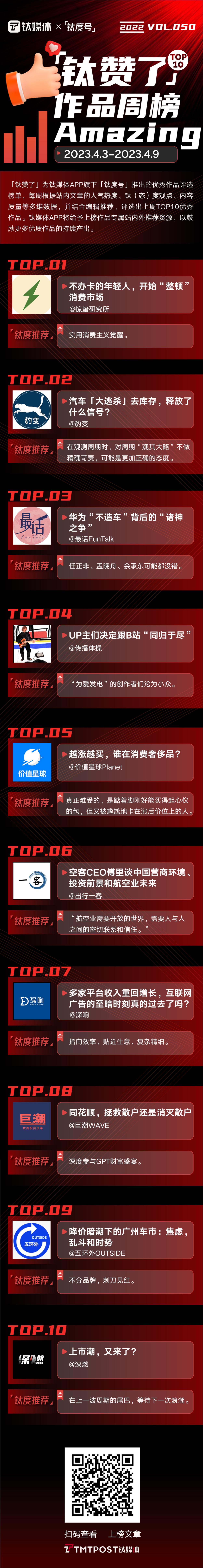 2023年4月3日—2023年4月9日,「钛赞了」榜单第50期上榜作品为: