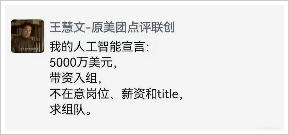 2月13日,蛰伏已久的王慧文宣布以5000万美元带资组队、打造属于中国的OpenAI。