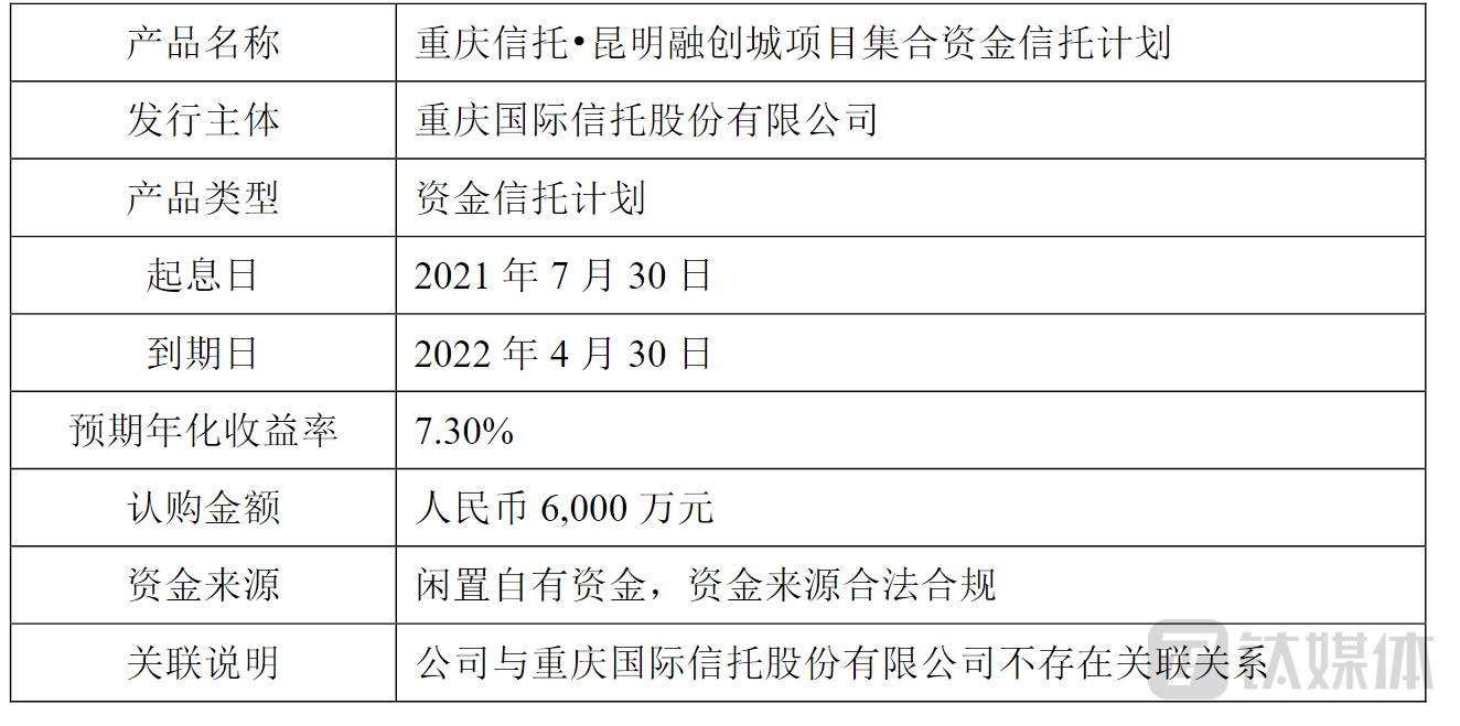 2021年7月30日,南华仪器以自有资金6000万元认购的重庆国际信托股份有限公司发行的“重庆信托昆明融创城项目集合资金信托计划”。