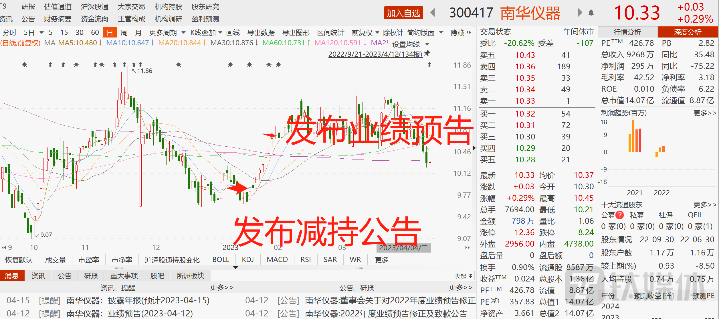 若结合南华仪器股价走势以及公司股东减持公告的时间来看,可能就看得出点端倪了。上市公司之所以这么操作,可能就是为了股东减持。