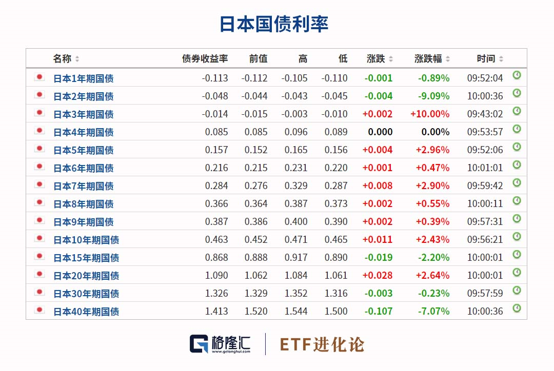 当前,日本是全球仅存的利率“洼地”。1年期、2年期、3年期国债收益率均为负数,10年期国债收益率0.463%,是全球融资成本最低的国家之一。
