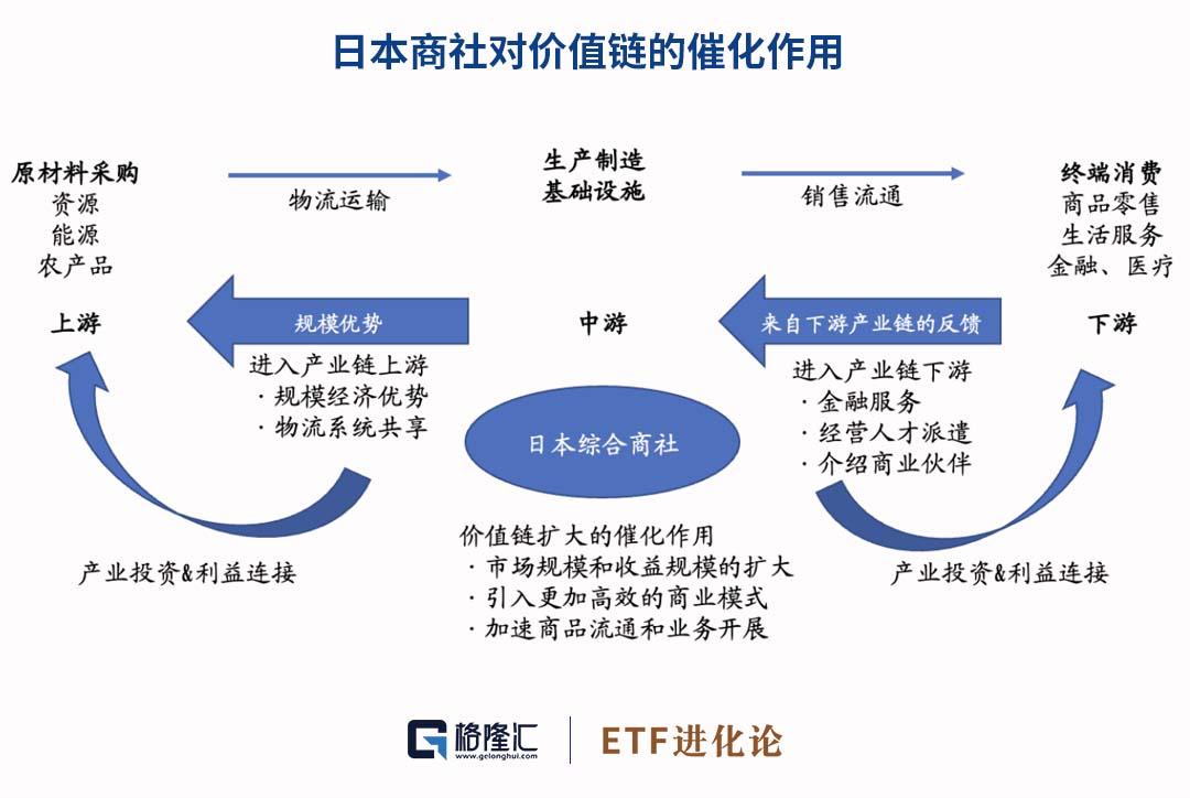 综合商事在从中介业务基础上,参与上游原材料采购,中游生产制造到下游零售流通的全过程,同时日本商社通过产业投资使得产业链上下游的参与者更加紧密的绑定在一起,由此原材料采购中的规模经济优势和物流系统共享使得成本降低成为可能,更能精确得到客户的反馈,从而可以灵活调整价格、生产量以及库存,实现产业链的降本增效,价值链的延伸拓宽。