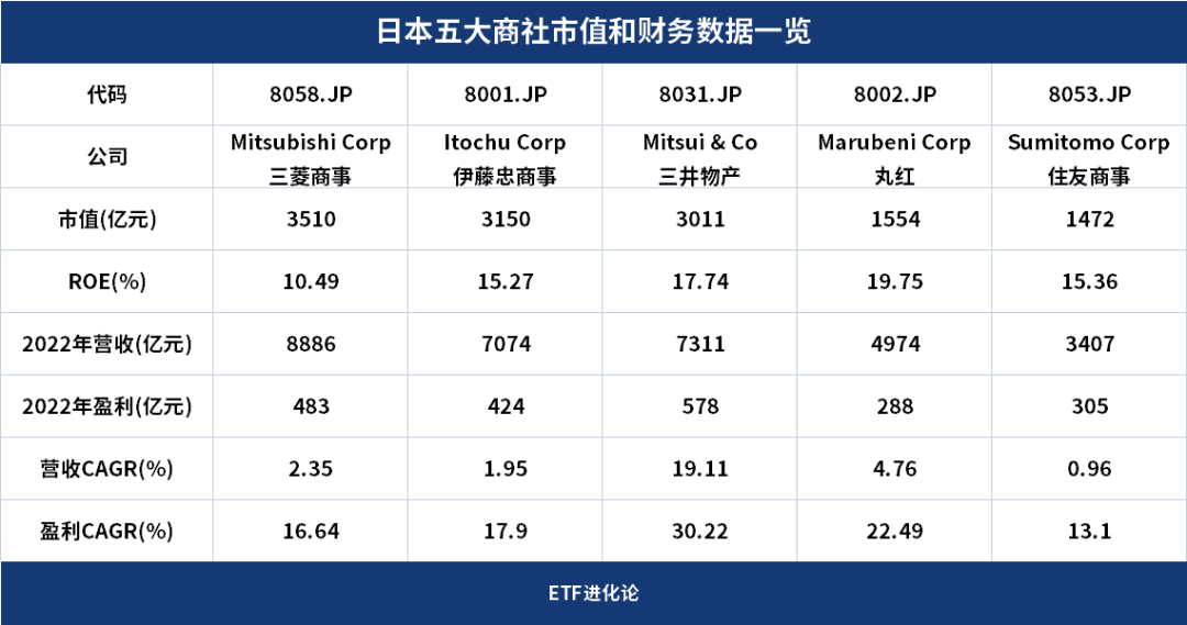 三菱商事、伊藤忠商事、三井物产等为代表的综合商社在日本商品流通领域占据着主导地位,这五家商事均为千亿人民币市值体量的头部公司。