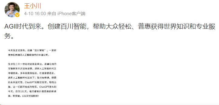 到了4月,搜狗创始人王小川也宣布开启人工智能大模型领域创业,新公司被命名为百川智能,目前已经获得了5000万美元启动资金,这些资金均来自王小川与其业内好友的个人支持。